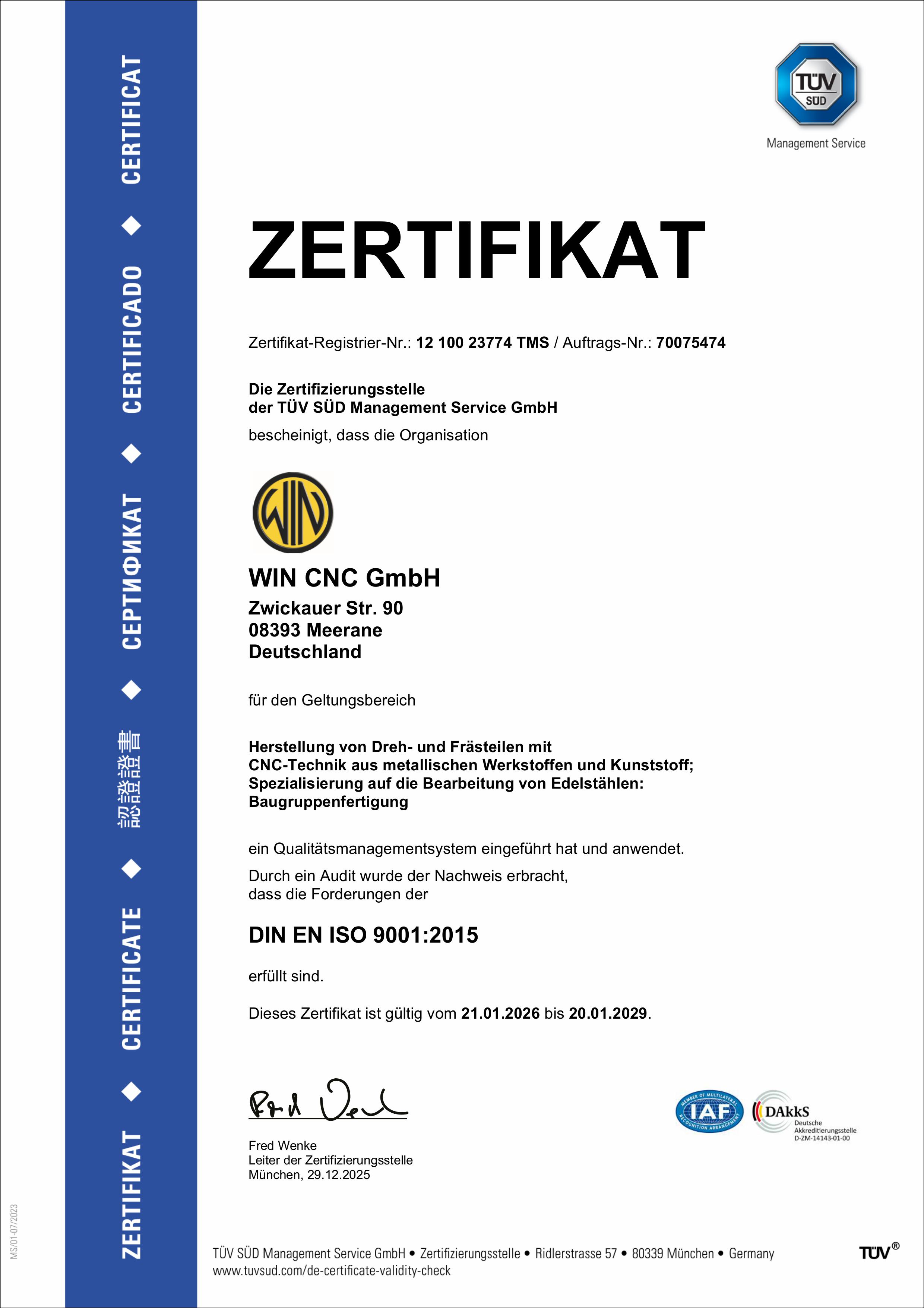 für den Geltungsbereich Herstellung von Dreh- und Frästeilen mit CNC-Technik aus metallischen Werkstoffen und Kunststoff; Spezialisierung auf die Bearbeitung von Edelstählen: Baugruppenfertigung ein Qualitätsmanagementsystem eingeführt hat und anwendet. Durch ein Audit, Auftrags-Nr. 70075474, wurde der Nachweis erbracht, dass die Forderungen der DIN EN ISO 9001:2015 erfüllt sind.